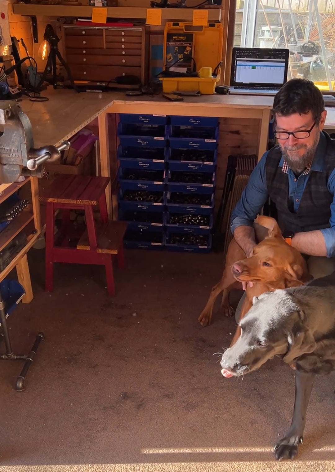I share my workshop with my jeweller fiancee and three mad Labradors!
