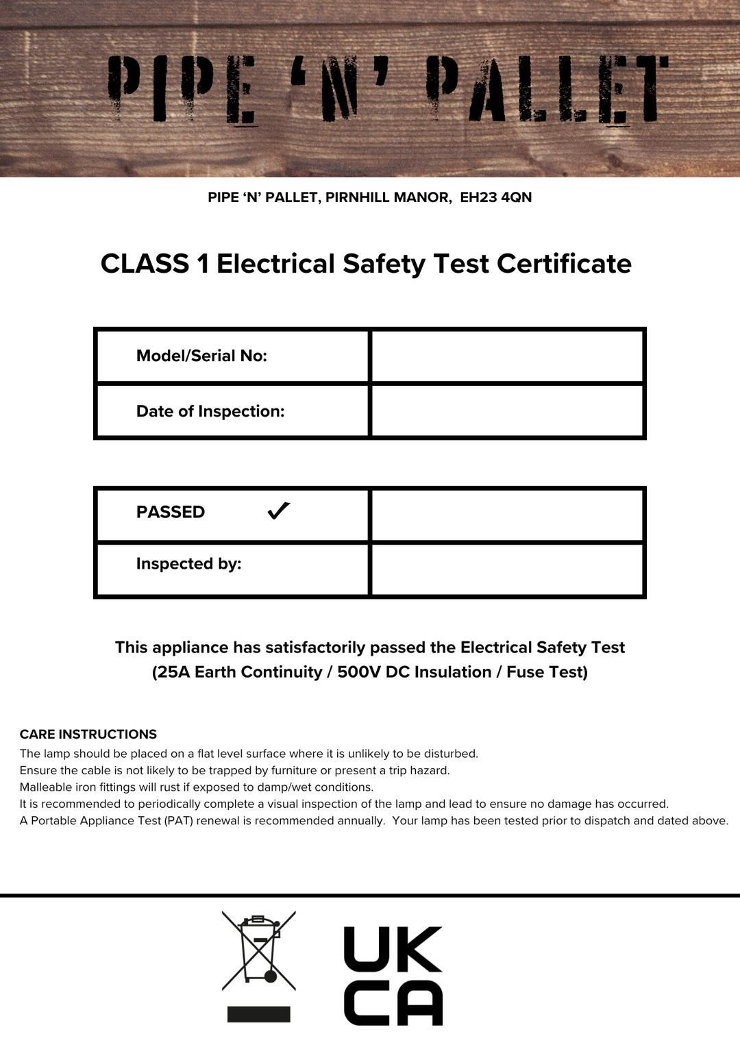 As a qualified PAT tester myself, I am able to test each lamp before dispatch to ensure it complies with safety standards. You are supplied with a test certificate with your lamp.